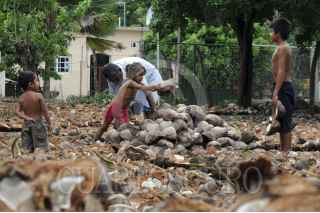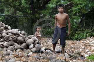 ACAPULCO, GUERRERO, 17JUNIO2014.- Familias que no poseen tierras alquilan su fuerza de trabajo a productores que poseen las amplias zonas de cocoteros de la región de la Costa Grande y Costa Chica en Guerrero. En Coyuca de Benítez se les conoce como tumbadores de coco, y en ocasiones llevan a sus hijos a participar en las duras jornadas de trabajo que está relacionado con la venta y compra de copra. Los productores pagan a los tumbadores por gruesa, que equivale a 140 cocos, mismos que parten con hachas y son colocados hacía arriba una vez que son llevados a los asoleaderos, donde exponen el coco al sol durante dos o tres días para después extraer la pulpa de la concha que es empacada en costales para su venta a los compradores de coco que acaparan la producción de copra en la región, aunque antes se entregaba, a Agroindustrias del Sur, mejor conocida como la aceitera, un organismo del gobierno del estado que adquiriría la producción a los copreros, pero en estos momentos está cerrada por falta de inversión gubernamental. FOTO: BERNANDINO HERNÁNDEZ /CUARTOSCURO.COM