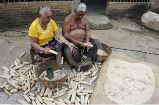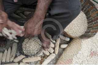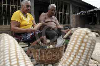 COYUCA DE BENITEZ, GUERRERO, 17JUNIO2014.- La señora Natividad Gutiérrez Gallegos, y su esposo, Felipe Rivera Roque desgranan las mazorcas de maíz que ponen a asolear tras ser cortados en sus huertas para poder desgranar con facilidad; los granos de maíz son utilizados para uso doméstico, es decir lo hacen nixtamal y hacen la masa para echar las tortillas, este procedimiento se realiza en la mayor parte de los hogares de las familias de Carrera Larga, comunidad rural de Coyuca de Benítez y la mayor parte de las comunidades de la sierra de este municipio, donde no se han instalado tortillerías, tratándose de una tradición milenaria. Asimismo, en algunos casos, ponen a asolear las mazorcas en los corredores de las viviendas para alejar el abrocito, un insecto que carcome los granos de maíz. FOTO: BERNANDINO HERNÁNDEZ /CUARTOSCURO.COM