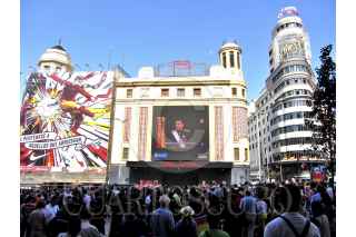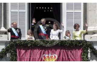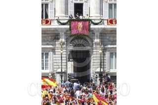 MADRID, ESPAÑA, 19JUNIO2014.- Miles de personas acudieron a la entronización del Rey Felipe VI, en el relevo generacional de una dinastía de reyes de la familia Borbon que ha reinado España desde hace mas de 2 siglos, luego de la dinastía de los Austrias, que duro un periodo similar, y de los Reyes Católicos, que consolidaron el reino moderno de España, tal y como se le conoce. El Nuevo Rey señaló en su discurso que el régimen de monarquía parlamentaria hace bien al desarrollo político de España. En las calles, miles de personas salieron a respaldar al nuevo jefe de estado español, y la Plaza del Sol, donde se esperaban pronunciamientos republicanos, que fue prohibida para ello, y se arrestaron a 3 personas que querían protestar. FOTO: IVÁN RENDÓN /CUARTOSCURO.COM