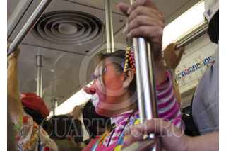 MÉXICO, D.F., 20JUNIO2014.- Una payasita observa a través de la ventana del vagón; el metro es crisol de personajes. FOTO: MARÍA JOSÉ MARTÍNEZ /CUARTOSCURO.COM