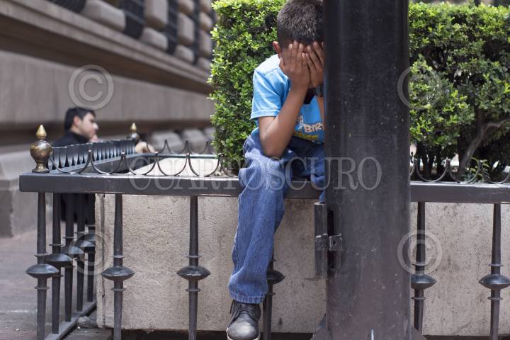 MEXICO, D.F., 22JUNIO2014.-Un niño juega en la estatua de una fuente de la Alameda Central, mientras sus padres le toman fotos. FOTO: DAVID POLO /CUARTOSCURO.COM