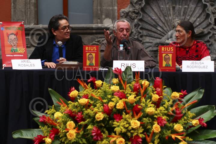 MEXICO, D.F. 28JUNIO2014.- El monero y escritor Eduardo del Rio, "Rius" presentó el dìa de hoy su libro titulado "Mis Confusiones. Memorias dememoriadas" en el museo de la Ciudad de Mèxico. En el marco del evento Rius celebró su cumpleaños número 80 partiendo un pastel con todos los asistentes. En la imagen, el escritor al momento de partir el pastel acompañada de Elena Poniatowska. FOTO: DAVID POLO/CUARTOSCURO.COM