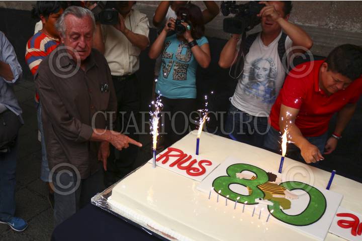 MEXICO, D.F. 28JUNIO2014.- El monero y escritor Eduardo del Rio, "Rius" presentó el dìa de hoy su libro titulado "Mis Confusiones. Memorias dememoriadas" en el museo de la Ciudad de Mèxico. En el marco del evento Rius celebró su cumpleaños número 80 partiendo un pastel con todos los asistentes. En la imagen, el escritor al momento de partir el pastel acompañada de Elena Poniatowska. FOTO: DAVID POLO/CUARTOSCURO.COM