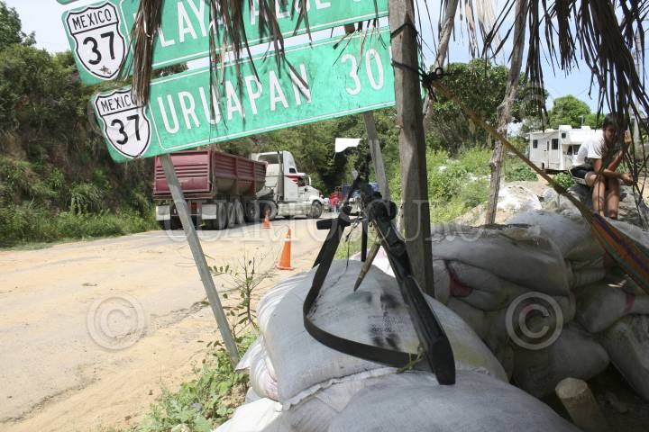 LÁZARO CÁRDENAS, MICHOACÁN, 28JUNIO2014.- Continúan los bloqueos carreteros en la costa michoacana a favor del doctor José Manuel Mireles Valverde, desde Caleta de Campos, La Huahua, Boca de Apiza y hasta llegar al vecino municipio de Aquila, ya en los límites con el estado de Colima, todo ello en pro de la libertad del polémico galeno y de los 82 hombres con quienes lo agarraron; en este contexto, cientos de soldados y marinos se desplegaron por la región, pare evitar brotes de violencia. FOTO: JUAN JOSÉ ESTRADA SERAFÍN /CUARTOSCURO.COM