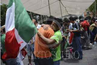 XALAPA, VERACRUZ, 29JUNIO14.- Aficionados al fútbol que asistieron al parque Juárez con las caras pintadas, sombreros y banderas nacionales, rompieron en llanto tras la derrota de la selección mexicana de fútbol 2 goles contra 1 ante su similar de Holanda quedando así fuera del mundial de fútbol Brasil 2014. FOTO: RUBÉN ESPINOSA / CUARTOSCURO.COM