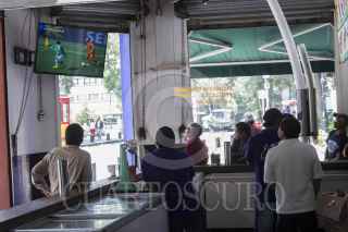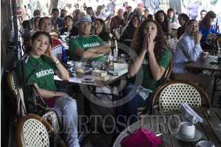 MEXICO, D.F., 29JUNIO2014.- Capitalinos se dieron cita en diferentes restaurantes y cafés de la ciudad para disfrutar el encuentro entre la selección mexicana y la holandesa de fútbol. En la imagen, gestos de los espectadores durante el partido. FOTO: DAVID POLO /CUARTOSCURO.COM