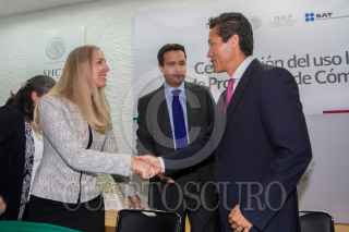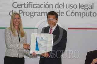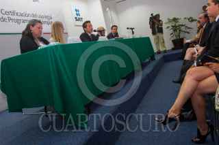 MÉXICO, D.F., 01JULIO2014.- Aristóteles Núñez Sánchez, jefe del Servicio de Administración Tributaria, recibió de Jodie L. Kelley, representante de Business Software Alliance, la Certificación del uso legal de Programas de Cómputo en la dependencia. FOTO: ISAAC ESQUIVEL /CUARTOSCURO.COM