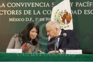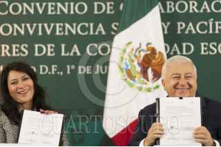 MÉXICO, D.F., 01JULIO2014.- Laura Vargas Carrillo, titular del DIF Nacional; y Emilio Chauffet, Secretario de Educación Pública; firmaron un convenio de colaboración para promover una convivencia pacífica en las escuelas. FOTO: IVÁN STEPHENS /CUARTOSCURO.COM