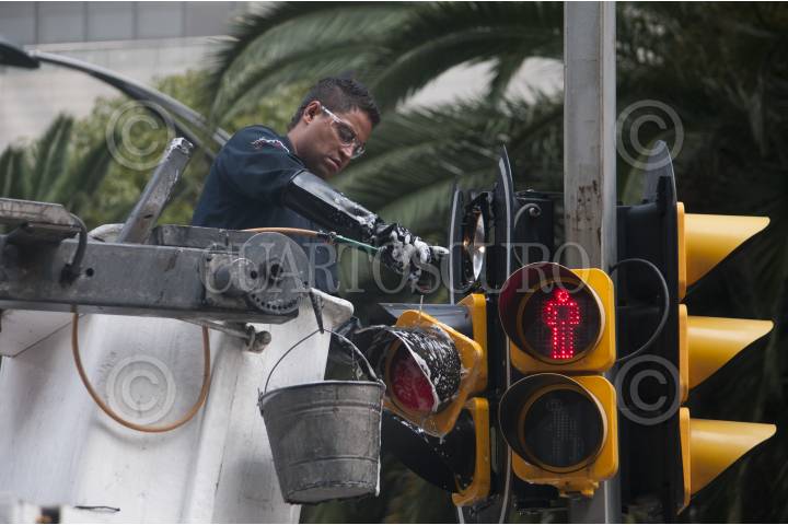 MÉXICO, D.F., 02JULIO2014.- Un hombre pega los vidrios de un edificio recien construido sobre avenida Juárez; al fondo, uno de los edificios más emblemáticos de la ciudad de México, la Torre Latinoamericana. FOTO: DIEGO SIMÓN SÁNCHEZ /CUARTOSCURO.COM
