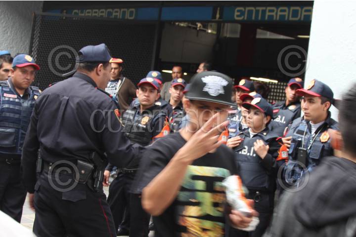 MÉXICO, D.F., 03JULIO2014.- Policias de la Secretaría de Seguridad Pública del D.F. adscritos a la seguridad del Sistema de Transporte Colectivo Metro, detuvieron a 18 jovenes que causaron daños en la estación Chabacano de la Línea 9, quienes lanzaron dos petardos al interior de la estación. Dichas personas fueron puestas a disposición ante el ministerio público. FOTO: SAÚL LÓPEZ / CUARTOSCURO.COM
