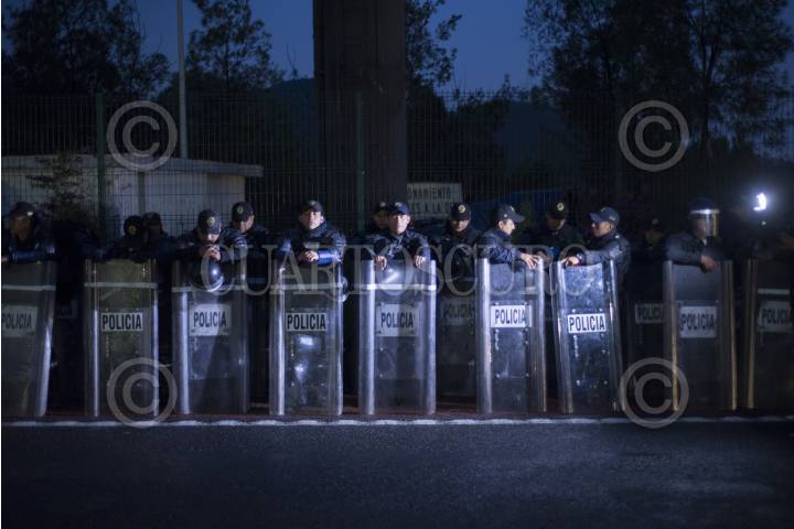 MÉXICO, D.F., 04JULIO2014.- Desde las 05:00 horas de esta madrugada, granaderos acudieron a los cruces específicos de las principales vialidades y entradas de la capital, para tomar previsión de los bloqueos por la nueva reglamentación del programa Hoy No Circula. En la imagen, la caseta de la autopista México-Cuernavaca en donde hubo un pequeño conato de violencia cuando los elementos policiales impidieron el paso a los inconformes. FOTO: PEDRO ANZA /CUARTOSCURO.COM