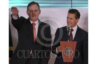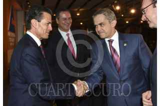 MÉXICO, D.F., 04JULIO2014.- El Presidente Enrique Peña Nieto informó hoy, en la ceremonia en que tomó protesta al Comité Ejecutivo y al Consejo Directivo de la CONCANACO-SERVyTUR para el periodo 2014-2015, la cual será encabezada por Enrique Solana, que en lo que va de la Administración, “el personal asegurado en el Instituto Mexicano del Seguro que se dedica a las actividades del comercio, los servicios para empresas, personas y el hogar se ha incrementado en 198 mil trabajadores”. En la imagen saluda al Jefe de Gobierno Miguel Ángel Mancera. FOTO: PRESIDENCIA /CUARTOSCURO.COM