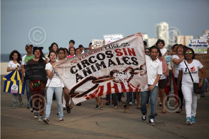 VERACRUZ, VERACRUZ., 06JULIO2014.- Decenas de activistas protestaron en las principales calles del puerto para exigir a las autoridades una modificación al código penal que prohiba los circos con animales. Los manifestantes también se postularon en contra de los espectáculos del acuario de Veracruz donde se exhiben delfines y próximamente pingüinos. FOTO: FÉLIX MÁRQUEZ / CUARTOSCURO.COM