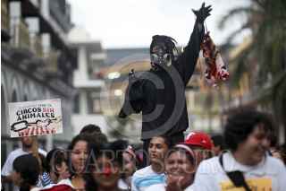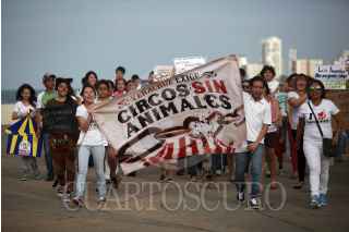 VERACRUZ, VERACRUZ., 06JULIO2014.- Decenas de activistas protestaron en las principales calles del puerto para exigir a las autoridades una modificación al código penal que prohiba los circos con animales. Los manifestantes también se postularon en contra de los espectáculos del acuario de Veracruz donde se exhiben delfines y próximamente pingüinos. FOTO: FÉLIX MÁRQUEZ / CUARTOSCURO.COM
