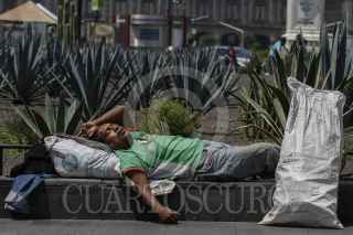 MÉXICO, D.F., 08JULIO2014.- Un indigente toma un descanso en una jardinera a un costado de la Catedral Metropolitana. FOTO: RODOLFO ANGULO /CUARTOSCURO.COM