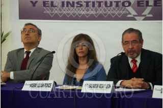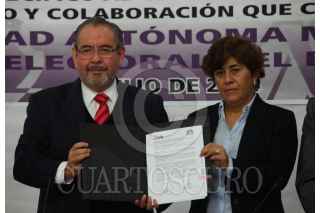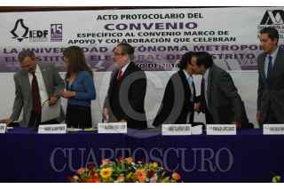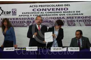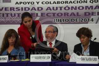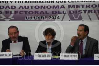 MÉXICO,D.F.,09JULIO2014.- Norberto Manjarrez, secretario general de la UAM; Noemí Luján Ponce, Consejera de la Comisión de Organización y Geografía Electoral del IEDF; el rector general de la UAM, Salvador Vega; lla consejera presidente del Instituto Electoral del Distrito Federal (IEDF), Diana Talavera Flores; Romualdo López Zárate, rector de la UAM Azcapotzalco; y Juan Carlos Sánchez León, consejero electoral del IEDF, durante la firma del convenio entre la UAM y el IEDF. FOTO: MARÍA JOSÉ MARTÍNEZ /CUARTOSCURO.COM