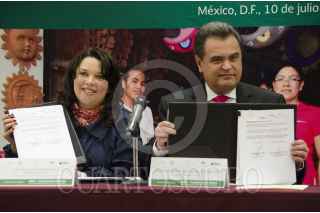 MÉXICO, D.F., 10JULIO2014.- El Instituto Nacional para la Educación de los Adultos (INEA) y el Banco Compartamos firmaron un convenio de colaboración entre las dos instituciones cuyo objetivo es brindar los servicios de lecto-escritura, primaria y secundaria a un aproximado de 2 millones de clientes de la empresa bancaria. La acción se realizará en los estados de Puebla, Veracruz, Oaxaca y Distrito Federal. Al evento acudieron los firmantes, Rosana Concepción Díaz González, subdirectora de responsabilidad social y sustentabilidad,; Lilian Ayleen Margarita Cortés Sandoval, directora de responsabilidad corporativa; Alfredo Antonio Llorente, director general del INEA; Maritza Ordaz Sánchez, delegada del INEA en el D.F.; y Susana Magaña Barajas, directora de concertación y alianzas estratégicas del INEA. FOTO: MARÍA JOSÉ MARTÍNEZ /CUARTOSCURO.COM