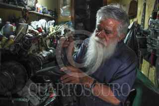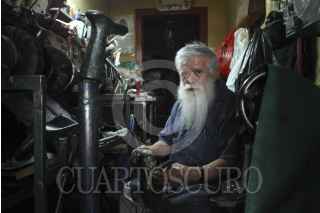 MÉXICO, D.F., 14JULIO2914.- Don Guillermo Ortiz González, un señor que lleva mas de 8 años trabajando en su taller de Zapatería “San Crispín” en Insurgentes Centro 42-B en la colonia San Rafael, cuenta que desde hace ya algunos años este oficio a desaparecido en gran parte de la ciudad puesto que la gente cada vez menos acude los talleres a reparar su calzado al preferir comprar nuevos zapatos. Los materiales y la renta también son otro factor que han hecho que en la ciudad casi ya no se vean zapateros; Don Guillermo también menciona que en su taller la gente acude mucho ya que en su mostrador cuenta con decenas de monedas de todo el mundo y principalmente de México. FOTO: ENRIQUE ORDÓÑEZ /CUARTOSCURO.COM