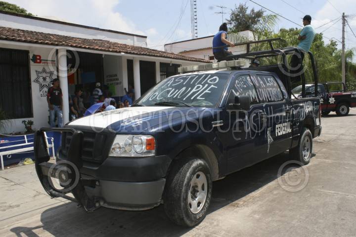 BUENAVISTA TOMATLÁN, MICHOACÁN. 15JULIO2014.- Habitantes de la cabecera municipal mantienen retenidos a 9 policías federales y 2 elementos de la Policía Ministerial de Michoacán. Se trata de familiares del primer grupo de autodefensas que fueron detenidos en marzo del 2013 por portación de armas de uso exclusivo del Ejército. Los familiares exigen la libertad inmediata de los detenidos ya que consideran que el proceso legal para recuperar su libertad va muy lento. La mayoría de los inculpados están recluidos en el Cereso de Apatzingán. FOTO: JUAN JOSÉ ESTRADA SERAFÍN /CUARTOSCURO.COM