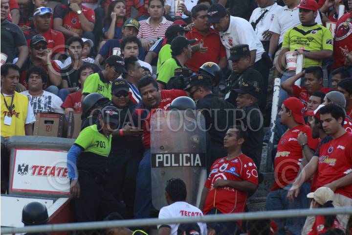 BOCA DEL RÍO, VERACRUZ, 19JULIO2014.- Acciones del encuentro entre Tiburones Rojos de Veracruz y Santos de la Laguna, los cuales vencieron a los locales 1 por 0 en el primer encuentro del torneo apertura 2014. Por momentos los ánimos se calentaron en la tribuna y en las calles donde se presentaron incidentes de violencia. FOTO: FÉLIX MÁRQUEZ /CUARTOSCURO.COM