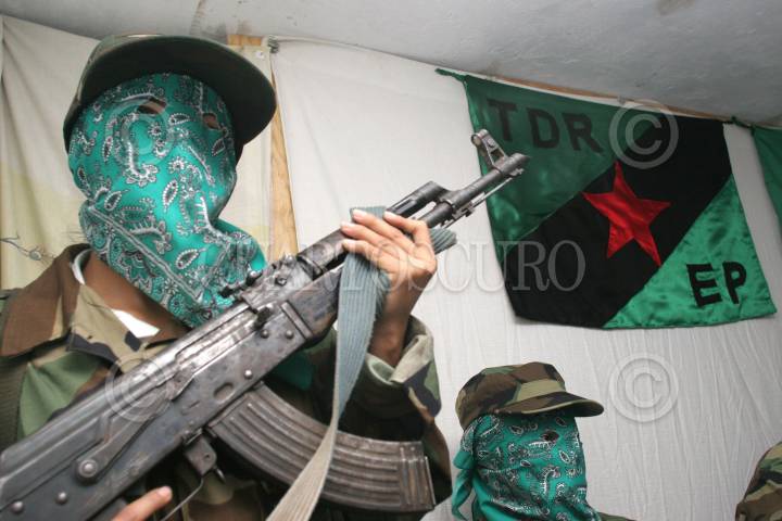 LUGAR DESCONOCIDO, 26 ENERO 2006.- Mas de una docena de integrantes del grupo armado guerrilero Tendencia Democrática Revolucionaria-Ejercito del Pueblo (TDR-EP) ofrecieron una conferencia de prensa para informar su decisión de establecer una tregua durante los meses de Enero y julio del 2006, comprometiendose así a no desarrollar ninguna acción político-militar. Asimismo expresaron su simpatía con la "Otra campaña" emprendida por el EZLN. Los combatientes Citlali, Vicente , José Arturo y Bolivar emitieron diversos comunicados. FOTO: Germàn Romero/CUARTOSCURO.COM