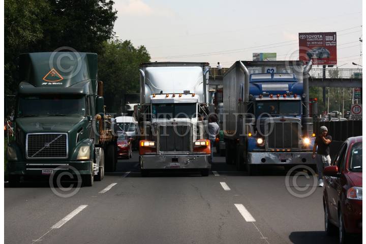 CUAUTITLÁN IZCALLI, ESTADO DE MÉXICO, 23JULIO2014.- Un aproximado entre 50 y 60 camiones de carga y transportistas provenientes de diferentes puntos de la República, bloquearon la Autopista México- Querétaro. Realizaron una marcha desde el km. 40 rumbo a la Av. 1º de Mayo en Naucalpan, como protesta por la restricción de horarios de circulación que se han implementado en la zona metropolitana, así como el alza del precio en los combustibles. FOTO: LUIS CARBAYO /CUARTOSCURO.COM