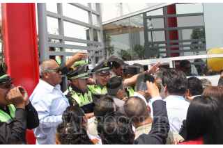 LOS REYES LA PAZ, 24JULIO2014.- Habitantes de los Reyes la Paz intentaron dar portazo durante la inauguración del mega proyecto deportivo Soraya Jiménez, Plaza Estado de México, después que elementos de seguridad y personal de logística les negaron el acceso. Granaderos del Edomex asistieron al lugar para para resguardar los acceso al deportivo. FOTO: SAUL LOPEZ /CUARTOSCURO.COM