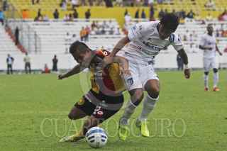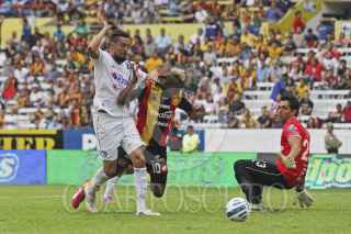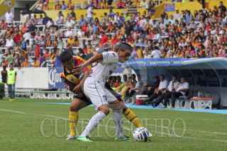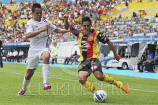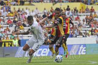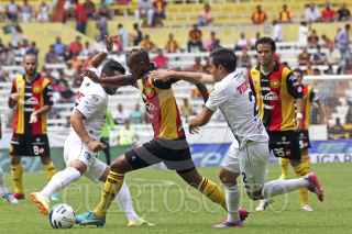 GUADALAJARA, JALISCO, 27JULIO2014.- Los Leones Negros de la Universidad de Guadalajara perdieron un gol a cero ante los Gallos Blancos de Querétaro en el Estadio Jalisco en el partido correspondiente a la Jornada 2 del Torneo Apertura 2014 de la Liga MX. En la imagen el jugador de Leones Negros, Efrén Mendoza disputa un balón frente al contrario de Querétaro, Jorge Gastelum. FOTO: FERNANDO CARRANZA GARCIA /CUARTOSCURO.COM
