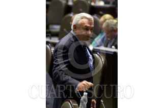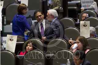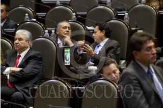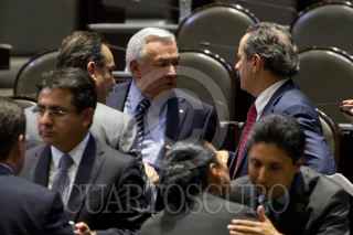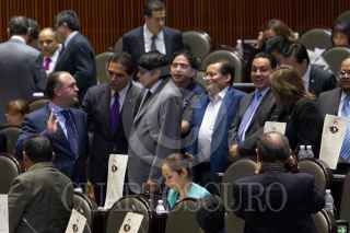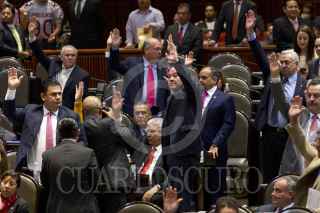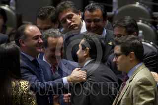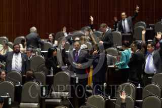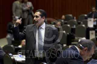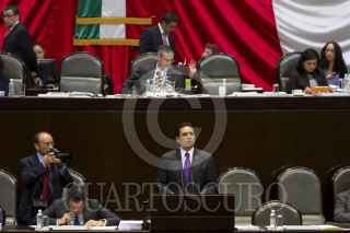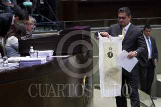 MÉXICO D.F., 28JULIO2014.- Luis Chazaro, diputado del PRD, coloca un pensamiento del expresidente Benito Juárez, al momento de su posesionamiento en tribuna, durante la sesión extraordinaria en la Cámara de Diputados donde se debaten los dictámenes de las leyes secundarias de la Reforma Energética. FOTO: GUILLERMO PEREA /CUARTOSCURO.COM