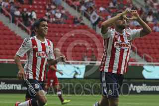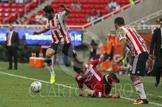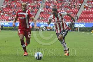 ZAPOPAN, JALISCO, 29JULIO2014.- Esta noche en el Estadio Omnilife y en partido correspondiente a la Jornada 1 de la Copa MX 2014, se enfrentan los equipos de las Chivas de Guadalajara frente a Coras de Tepic. En la imagen el jugador de Chivas, Edgar Solis disputa un balón frente al contrario de Coras, Jorge Mora. FOTO: FERNANDO CARRANZA GARCIA /CUARTOSCURO.COM