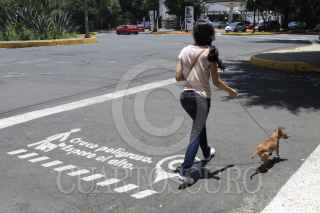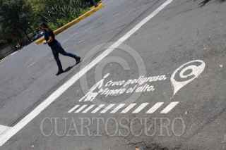 MÉXICO, D.F., 31JULIO2014.- En las calle de la colonia Condesa se han pintado en los cruceros peatonales la leyenda "Cruce peligroso. Espere el alto", esto para concientizar al peatón que muchas veces le quiere ganar al automóvil provocando accidentes. FOTO: MOISÉS PABLO /CUARTOSCURO.COM