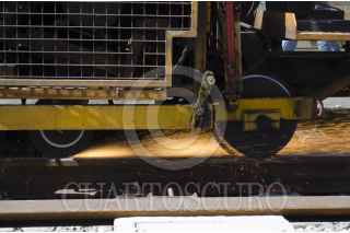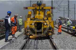 MÉXICO, D.F., 01AGOSTO2014.- La línea 12 del metro, que corre de Tláhuac a Mixcoac, aun no reanuda actividades en 11 de las estaciones que presentan fallas. Sobre una superficie de mil 200 metros del tramo entre las estaciones Nopalera y Zapotitlán, este fin de semana se realizarán las últimas seis pruebas dinámicas para después de arrojados los resultados, se proceda a analizar los datos capturados por los sensores dispuestos a lo largo de los rieles. Una máquina reperfiladora se utiliza en cada prueba dinámica, además de una máquina esmeriladora y un equipo de medición de desgaste. En análisis será realizado por especialistas de México y Francia. FOTO: MARÍA JOSÉ MARTÍNEZ /CUARTOSCURO.COM