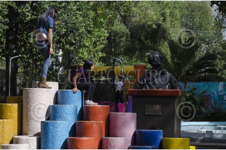 MÉXICO, D.F., 02AGOSTO2014.- De forma entretenida y expectante, un niño espera el descenso de un cachorro que asustado se aferra al desliz metálico de una resbaladilla. FOTO: MARÍA JOSÉ MARTÍNEZ /CUARTOSCURO.COM