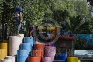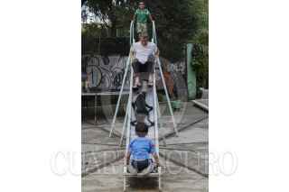 MÉXICO, D.F., 02AGOSTO2014.- De forma entretenida y expectante, un niño espera el descenso de un cachorro que asustado se aferra al desliz metálico de una resbaladilla. FOTO: MARÍA JOSÉ MARTÍNEZ /CUARTOSCURO.COM