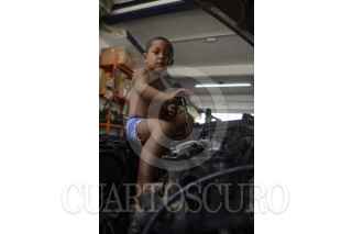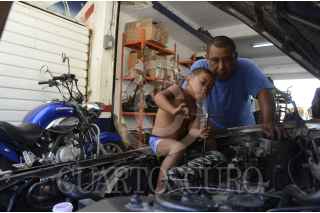 ACAPULCO, GUERERO, 14AGOSTO2014.- Un padre de familia de nombre Tony Carmona que tiene un taller mecánico le enseña el oficio a su niño Mark Antoni de tan solo 6 años quien ya puede quitar algunas piezas de un motor. FOTO: BERNANDINO HERNÁNDEZ /CUARTOSCURO.COM