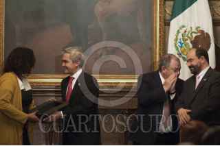MÉXICO, D.F., 14AGOSTO2014.- Tracy Robinson, presidenta de la Comisión Interamericana de Derechos Humanos, y Mguel Ángel Mancera, jefe de gobierno, durante la reunión que sostuvo la Comisión Interamericana de Derechos Humanos y el gobierno local en el salón de cabildos del GDF. FOTO: IVÁN STEPHENS /CUARTOSCURO.COM