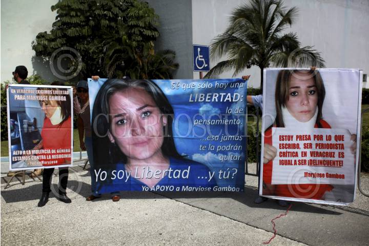BOCA DEL RÍO, VERACRUZ, 20AGOSTO2014.- Amigos de la columnista de Notiver, María Josefina Gamboa, que se encuentra encarcelada en un penal del municipio de Tuxpan, se manifestaron a las afueras del World Trade Center durante la reunión privada que sostuvieron autoridades estatales con el Secretario de Gobernación, Miguel Ángel Osorio Chong. Los manifestantes mostraron pancartas y lonas evidenciando los casos de asesinatos, desapariciones y encarcelamiento de periodistas en el estado de Veracruz. Cabe resaltar que la mañana de este miércoles se dio a conocer la desaparición del reportero policiaco del diario Notiver, Alberto Ayala. FOTO: FÉLIX MÁRQUEZ /CUARTOSCURO.COM
