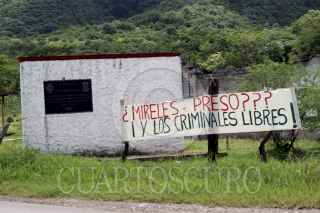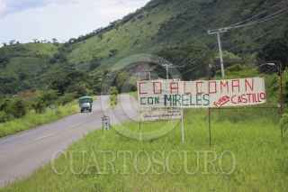 COALCOMÁN, MICHOACÁN, 23AGOSTO2014.- Ayer al mediodía fueron colocadas dos mantas a la entrada del municipio de Coalcomán, en apoyo al Dr. José Manuel Mireles, líder de los grupos de autodefensa. En la manta se lee "Fuera Castillo", quien es el Comisionado para la Seguridad y el Desarrollo Integral de Michoacán. Hace un año el grupo criminal de Los Caballeros Templarios fueron expulsados del municipio por los grupos de autodefensa. FOTO: JUAN JOSÉ ESTRADA SERAFÍN /CUARTOSCURO.COM