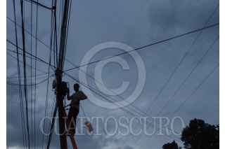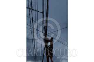 MÉXICO, D.F., 23AGOSTO2014.- No es un experto en desafiar el cable tenso circense, sin embargo es un experto colocador de fibra óptica. En la revolución digital parece que la fibra óptica, popularmente conocida como “banda ancha”, le ha ganado terreno al cable de cobre para la transmisión de redes de datos. Este hilo muy fino de vidrio o material plástico envía datos en forma de “haz de luz” y beneficia el incremento de los servicios de telefonía celular e Internet inalámbrico (WiFi). FOTO: MARÍA JOSÉ MARTÍNEZ /CUARTOSCURO.COM