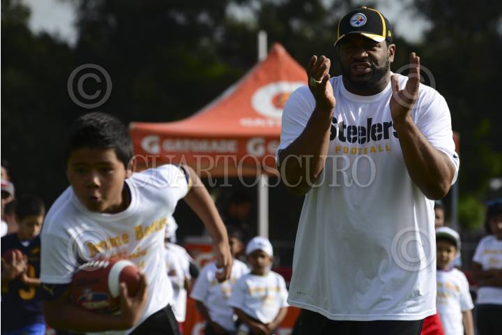 MÉXICO, D.F., 23AGOSTO2014.- Jerome Bettis ex-jugador de los Acereros de Pittsburgh, impartió una clínica de tochito en el Estadio Jesús Martínez "Palillo". FOTO: ISABEL MATEOS /CUARTOSCURO.COM
