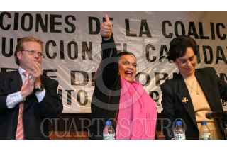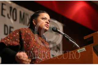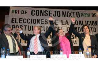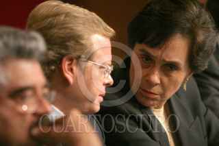 MEXICO, D.F., 02FEBRERO2006.- Arturo Escobar, presidente del PVEM DF y María de los Angeles Moreno, presidenta del PRI DF, durante la junta política de ambos partidos para anunciar la candidatura de Beatriz Paredes a la jefatura de gobierno, en el CEN del PRI. FOTO: Moisés Pablo/CUARTOSCURO.COM