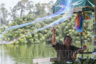 MÉXICO, D.F., 26AGOSTO2014.- Un comerciante hace pompas de jabón para promocionar los productos que vende a un costado del Lago Mayor en el Bosque de Chapultepec. FOTO: ISAAC ESQUIVEL /CUARTOSCRO.COM