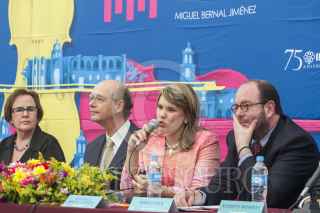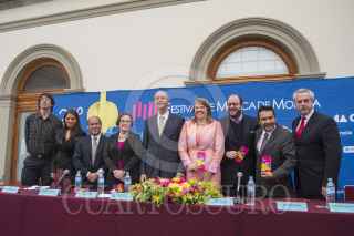 MÉXICO, D.F., 27AGOSTO2014.- El 26 Festival de Música de Morelia Miguel Bernal Jiménez anunció el programa, así como el costo de los accesos a los conciertos que se realizarán del 14 al 30 de noviembre en la capital michoacana. En la imagen, Verónica Bernal Vargas, directora del Festival, y Sergio Vela director artístico, acompañados de otro funcionarios, durante la conferencia de prensa donde se realizó el anuncio. FOTO: ISAAC ESQUIVEL /CUARTOSCURO.COM