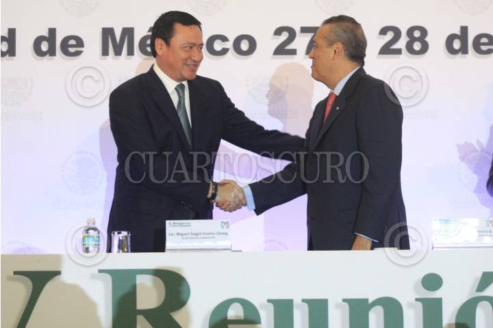 MÉXICO, D.F., 27AGOSTO2014.- El Secretario de Gobernación Miguel Ángel Osorio Chong y Manlio Fabio Beltrones tras participar en la V Reunión Plenaria de los Diputados del PRI. FOTO: MOISÉS PABLO /CUARTOSCURO.COM