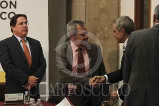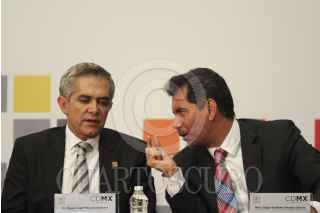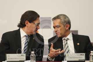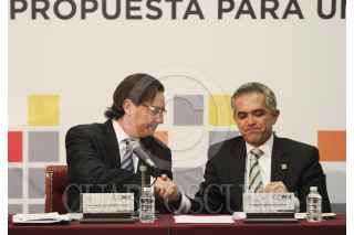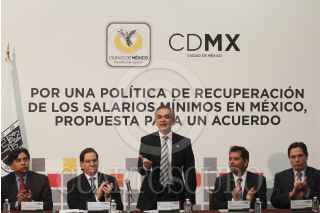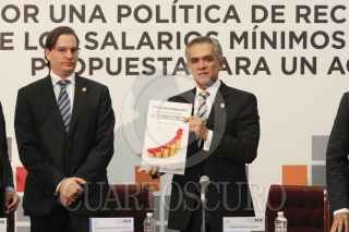 MÉXICO, D.F., 28AGOSTO2014.- Miguel Ángel Mancera, jefe de gobierno capitalino, Salomón Chertorivski Woldenberg, Secretario de Desarrollo Económico, Edgar Abraham Amador Zamora, Secretario de Finanzas y Gerardo Esquivel Hernández, investigador del Centro de Estudios Económicos del Colegio de México, durante la presentación de la propuesta para una acuerdo nacional "Por una Política de Recuperación de los Salarios Mínimos en México. FOTO: ADOLFO VLADIMIR /CUARTOSCURO.COM