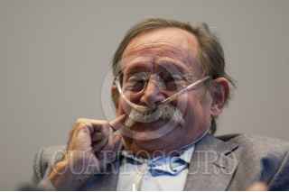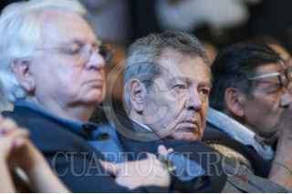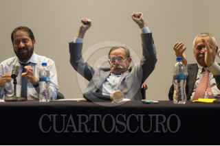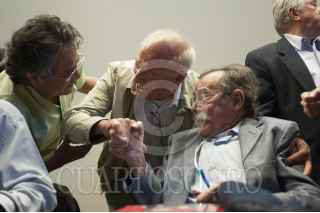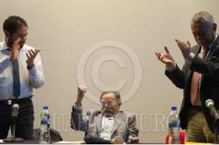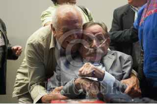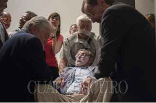 MÉXICO, D.F., 28AGOSTO2014.- José Woldenberg ayuda a Adolfo Sánchez Rebolledo al finalizar la presentación del libro "La Izquierda que viví" en la Biblioteca Rosario Castellanos. FOTO: IVÁN STEPHENS/CUARTOSCURO.COM