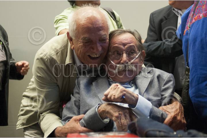 MÉXICO, D.F., 28AGOSTO2014.- José Woldenberg ayuda a Adolfo Sánchez Rebolledo al finalizar la presentación del libro "La Izquierda que viví" en la Biblioteca Rosario Castellanos. FOTO: IVÁN STEPHENS/CUARTOSCURO.COM