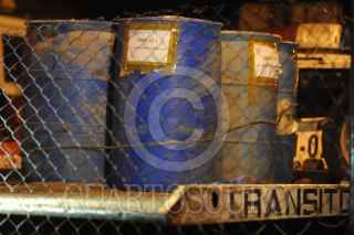 CHIMALHUACAN, ESTADO DE MÉXICO., 29OCTUBRE2014.- Fueron encontrados 6 tambos de 200 litros en el canal de desagüe de este municipio, lo que alerto a personal de protección civil, ya que se desconoce el contenido y su reacción con el medio ambiente. Dichos contenedores, fueron sustraídos por bomberos de este municipio y se resguardan en esta estación, mientras se investiga quien es responsable de este acto. FOTO: LUIS CARBAYO /CUARTOSCURO.COM