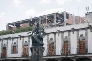 MÉXICO, D.F., 29AGOSTO2014.- Sobre el edificio de los Portales que se encuentra en la Plaza de Santo Domingo fue construida una estructura de hierro y tabique rojo, misma que fue clausurada con sellos del Instituto Nacional de Antropología e Historia (INAH), por violar la Ley Federal sobre Monumentos y zonas arqueológicas, artísticos e históricos. FOTO: DIEGO SIMÓN SÁNCHEZ /CUARTOSCURO.COM
