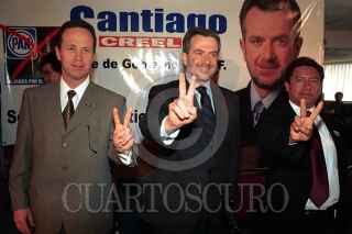 El candidato panista a la gubernatura del Distrito Fedral, Santiago Creel (centro) durante la conferencia en la que anunció la adhesión de cuarenta candidatos de la Nueva Repubica a su campaña.